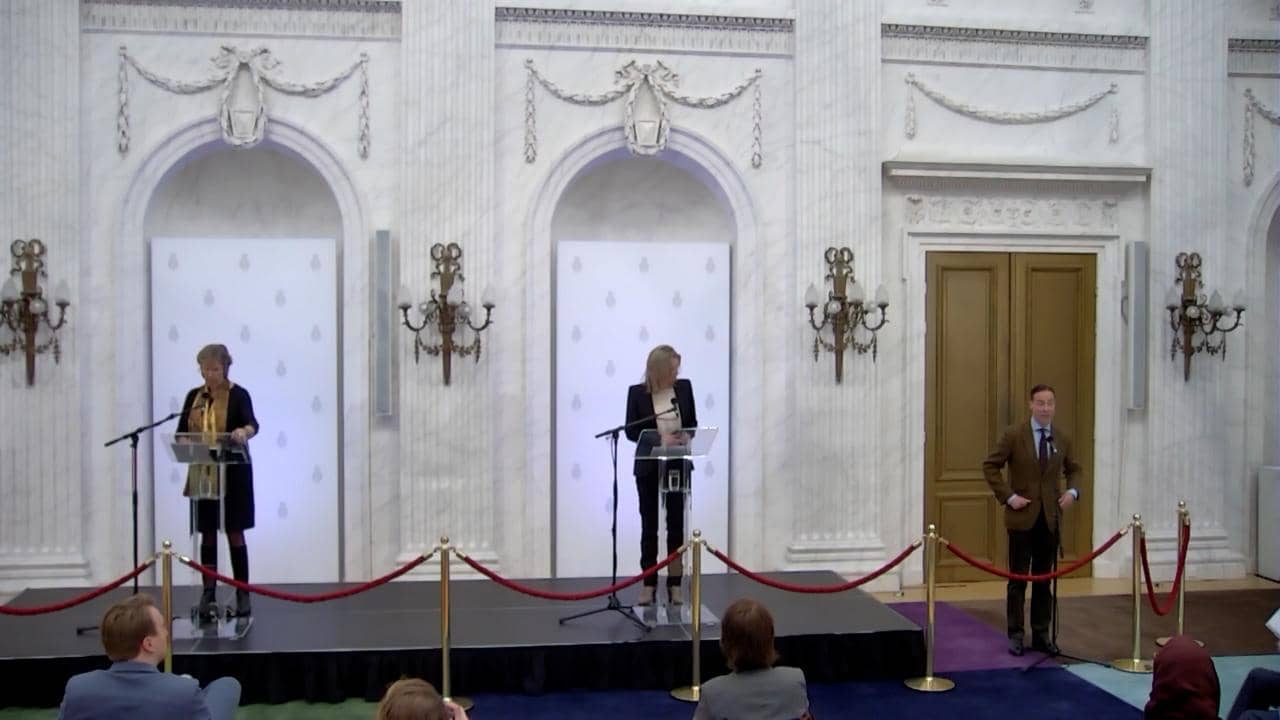 Tijdens een persconferentie in de Oude Zaal van de Tweede Kamer geven de verkenners Jorritsma en Ollongren een korte toelichting op hun werkzaamheden.